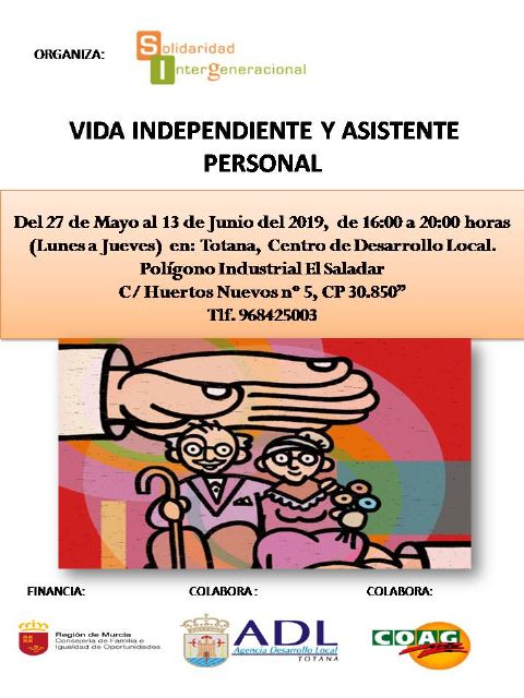 Solidaridad Intergeneracional organiza una acción formativa sobre "Vida independiente y asistente personal", con la colaboración del Ayuntamiento de Totana, del 27 de mayo al 13 de junio