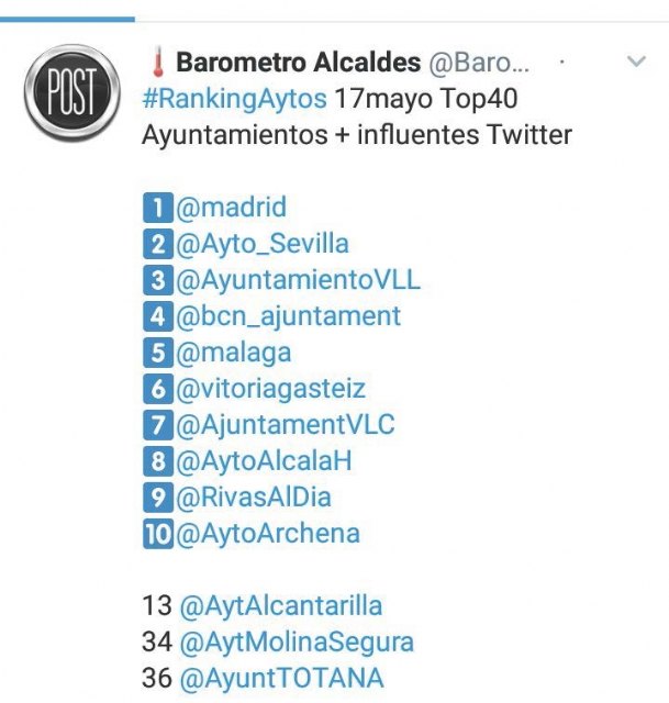 Por delante del perfil del Ayuntamiento de Totana, se sitúann en la Región de Murcia solamente los consistorios de Archena, Alcantarilla y Molina de Segura, que llevan más años trabajando la información municipal en dicha red social.