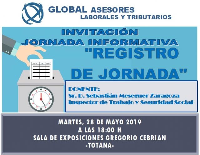 La Concejalía de Hacienda del Ayuntamiento de Totana colabora en la organización de la jornada informativa titulada "Registro de jornada", que promueve "Global Asesores Laborales y Tributarios el próximo martes, 28 de mayo, en la sala de exposiciones "Gregorio Cebrián", a partir de las 18:00 horas.
