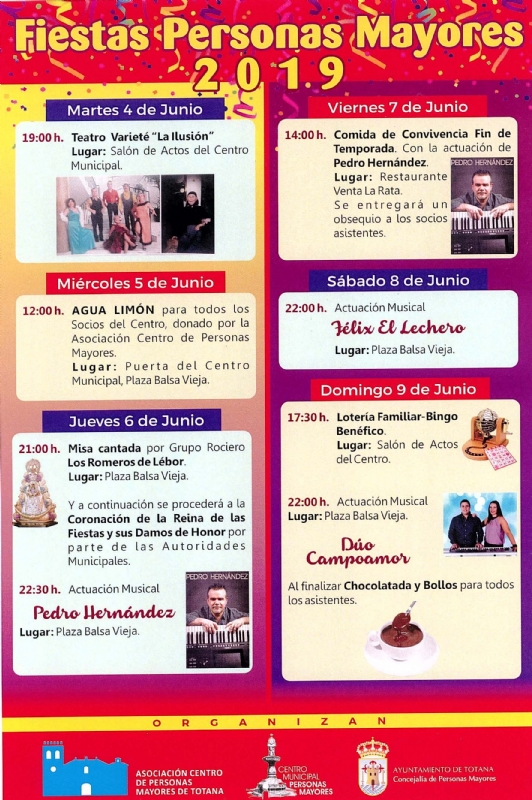 Las actividades están organizadas por la Asociación Centro de Personas Mayores de Totana y cuentan con la colaboración del Centro Municipal de Personas Mayores y la Concejalía de Personas Mayores del Ayuntamiento.