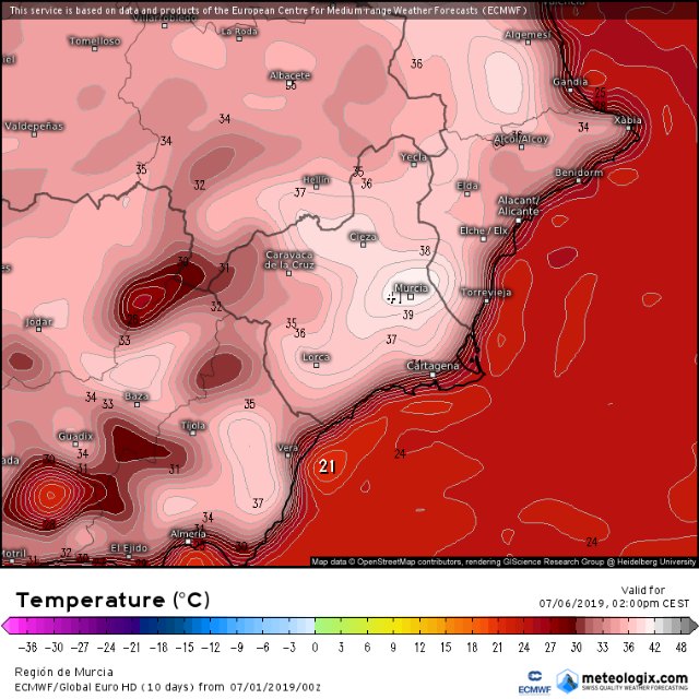 Pero a día de hoy todo parece indicar que de cara al fin de semana tendremos una subida importante de temperaturas debido a que otra masa de aire africano nos afectará, pero esta vez sí con viento de poniente, por lo que se pueden alcanzar los 40ºC en los valles del interior y prelitoral de la Región, incluso algunas salidas de modelos muestran que se podrían superar. Con esta situación, la Comunidad Valenciana y la Región de Murcia registrarían las temperaturas más altas de España.