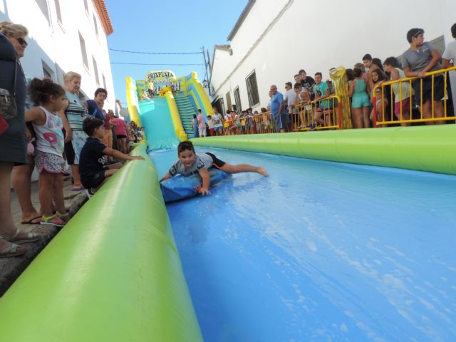 La Concejalía de Festejos instalará varias atracciones hinchables para niños y niñas, en este caso, tirolina, tobogán acuático y resbaladera, estos últimos los más grandes de España.