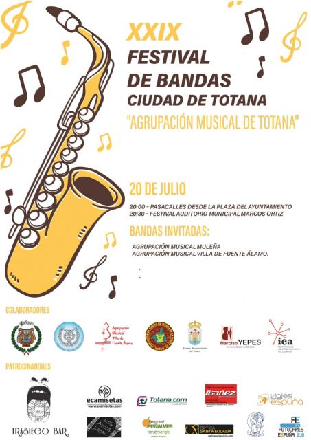 El auditorio del parque municipal "Marcos Ortiz" acogerá el sábado 20 de julio el XXIX Festival de Bandas "Ciudad de Totana", con la participación de las siguientes bandas: Agrupación Musical Muleña, Agrupación Musical Villa de Fuente Álamo y Agrupación Musical de Totana.