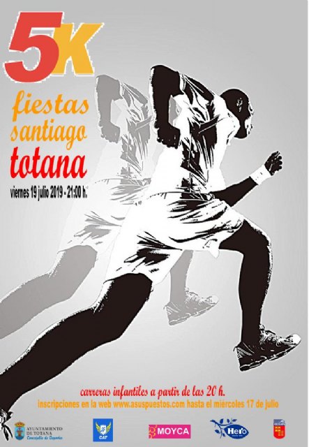 La Concejalía de Deportes del Ayuntamiento de Totana organiza, en colaboración con la Federación de Atletismo de la Región de Murcia, la prueba “5K Fiestas de Santiago”, enmarcada dentro del programa de festejos patronales de Totana 2019.