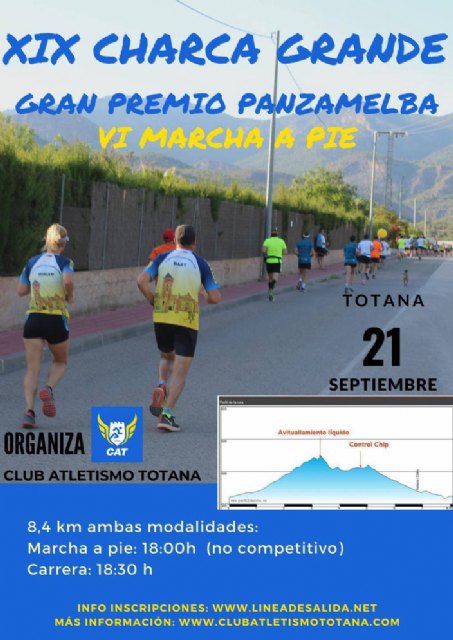 Las pruebas XIX Charca Grande-Gran Premio Panzamelba y la VI Marcha a Pie, que organizan el Club de Atletismo de Totana (CAT), se celebrarán el sábado 21 de septiembre sobre un circuito mixto de asfalto y tierra, con salida y meta en el Polideportivo Municipal "6 de Diciembre", según informaron fuentes municipales en un comunicado.