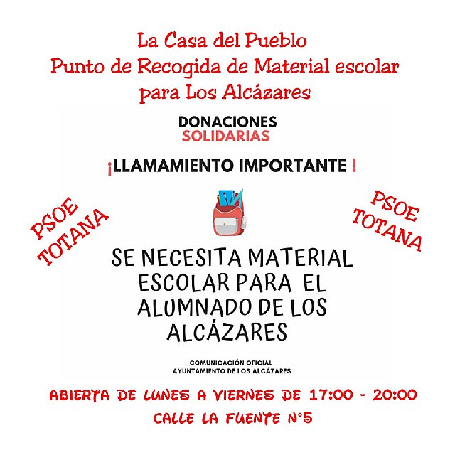 Se habilitará la Casa del Pueblo de Totana (Calle La Fuente, 5) de lunes a viernes en horario de 17:00 a 19:00 para la recogida de material escolar.
