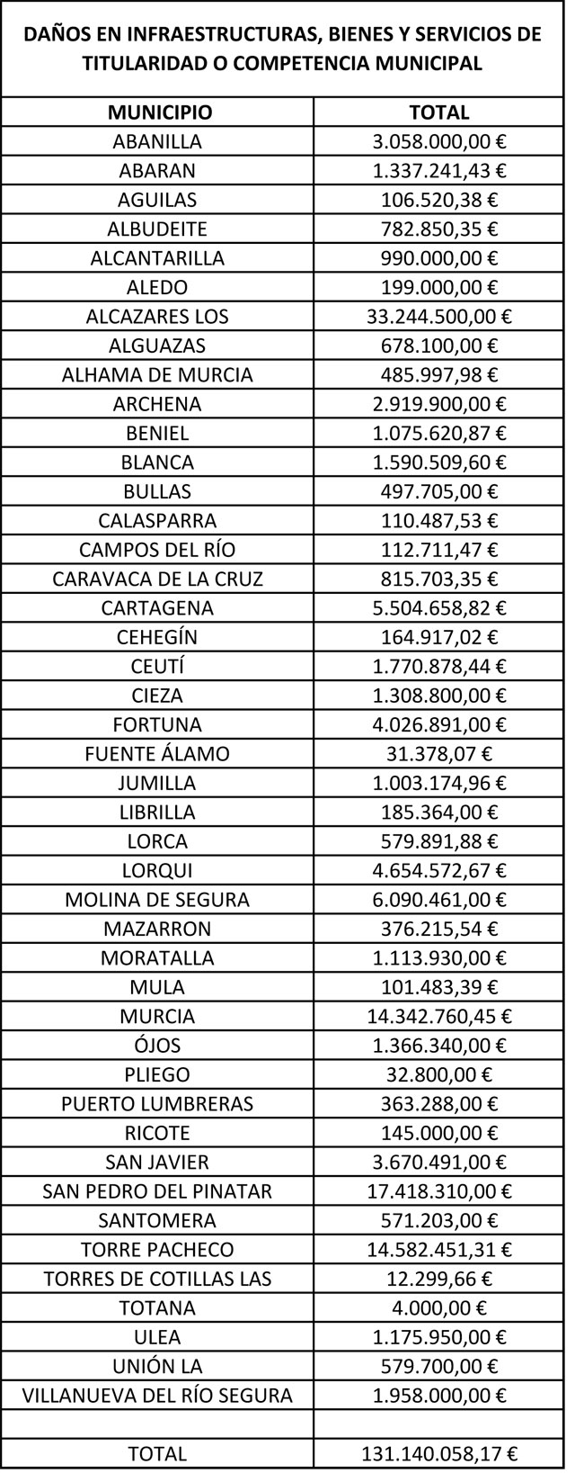 Del total de la evaluación de daños solicitados, un total de 46.052.304 euros son requeridos por daños en Bienes e Infraestructuras de Titularidad Estatal. Entre ellos están incluidos los correspondientes a la Demarcación de Costas (4.620.000 M€), la Demarcación Hidrográfica del Segura (25.500.000 M€), la Dirección General de Tráfico (185.942 euros), la Demarcación de Carreteras del Estado (4.297.580 M€), infraestructuras de la Guardia Civil (130.000 euros), de la Mancomunidad de Canales del Taibilla (4.218.182 M€), Puertos del Estado (30.000 euros), AENA (2.000 euros) y ADIF (7.068.600M€). En esta última ha sido incluido sólo la tasación del 50 por ciento, dado que la mitad restante corresponde a líneas afectadas de otras comunidades autónomas.