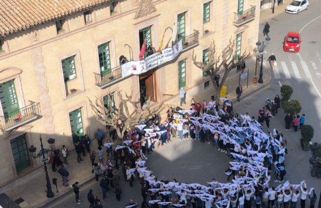 El acto tuvo lugar en la plaza de la Constitución y sirvió de homenaje a las víctimas con la lectura a cargo del manifiesto institucional que protagonizaron alumnos y alumnas de Educación Secundaria de los centros educativos de Totana, quienes también escenificaron un lazo con pañuelos reivindicativos  en este espacio urbano.