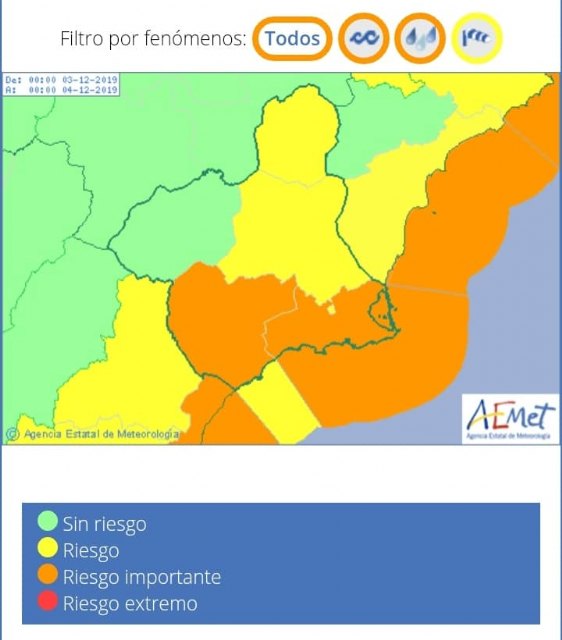 Además, habrá aviso NARANJA en el litoral por olas de 3 o 4 metros y aviso AMARILLO por vientos (70/80 km/h) en el Valle del Guadalentín, Lorca y Águilas, Campo de Cartagena y Mazarrón y Altiplano.