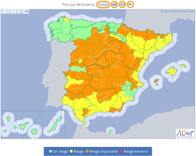 El viento será fuerte, con rachas muy fuertes en el Campo de Cartagena y Mazarrón y en zonas altas del Noroeste y del Valle del Guadalentín, Lorca y Águilas. Por ello, la AEMET ha activado el aviso amarillo por rachas que pueden superar los 70 km/h en estas zonas en cualquier momento del día, siguiendo activado el aviso en el Noroeste durante el sábado. En el Valle del Guadalentín, las rachas más intensas se registrarán en las sierras, y en el valle se podrían superar los 50 km/h. El domingo todavía se pueden registrar rachas fuertes de viento.