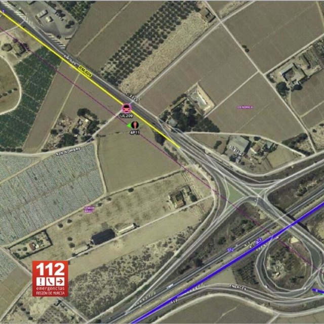 19:34 horas.- Servicios de emergencia han intervenido en un accidente de tráfico ocurrido en carretera RM-609, en la salida de Totana hacia la A-7, antes de llegar a la rotonda de acceso a la mencionada autovía.