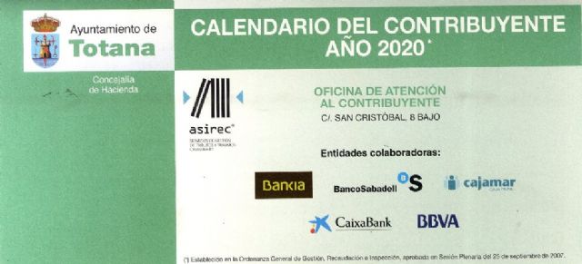 La Concejalía de Hacienda del Ayuntamiento de Totana ha hecho público el calendario del contribuyente del año 2020, con los conceptos y fechas previstas en período voluntario; para lo que ha editado dípticos que recogen toda la información para este ejercicio.