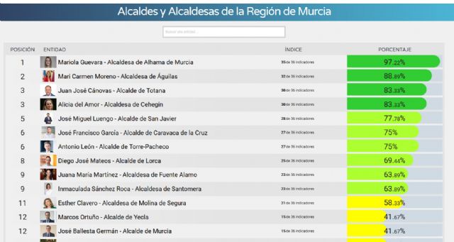 Juan José Cánovas se sitúa en el pódium de la transparencia regional con más del 80% de los indicadores que este ranking de la plataforma Dyntra exige. Siendo el único de la zona alta del ranking que lo hace sin tener personal a sueldo que se encargue de elaborar y subir datos a dicha plataforma, la cual no incluye cuestiones subjetivas como la atención al ciudadano en persona, o las Redes Sociales y su frecuencia de uso, lo que demuestra el interés que tiene por ser un alcalde de todos y para todos.