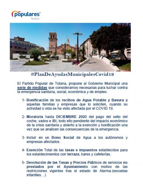 Según ha indicado Juan Pagán, portavoz del Grupo Municipal Popular; "es el momento de tomar decisiones para facilitar la vida de las familias, empresas y autónomos con el fin de poder paliar como mejor podamos esta grave crisis, tanto sanitaria contra la que estamos luchando, como la económica que se ha iniciado y por desgracia durará más que la sanitaria."