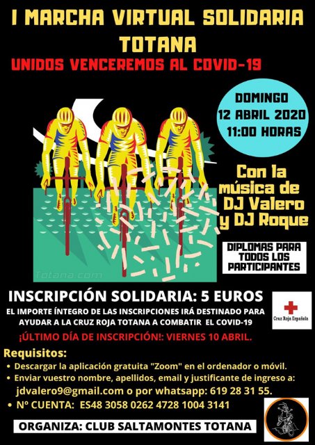 El Club Ciclista Saltamontes Totana organiza la I Marcha Virtual Solidaria "Unidos venceremos al COVID-19", cuya iniciativa parte del miembro del club José Daniel Valero Morillas y que tendrá lugar el domingo 12 de abril a las 11:00 horas.