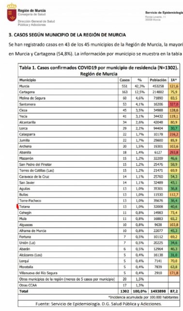 La Consejería de Salud continúa contabilizando, a fecha de hoy, Miércoles Santo, un total de 13 casos de coronavirus en Totana desde que comenzó la epidemia en la Región de Murcia, por lo que no se ha registrado ninguno más desde el pasado lunes que se ofreció la última cifra estadística oficial.