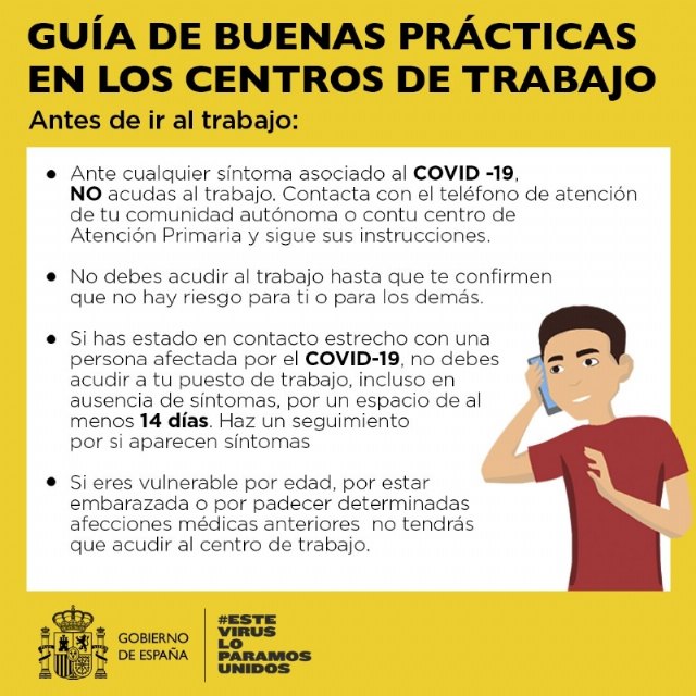 El Ayuntamiento de Totana recuerda que mañana lunes 13 de abril se retoma la actividad laboral en diversos sectores, por lo que desde los ministerios de Sanidad y de Trabajo y Economía Social han elaborado unas guías dirigidas a los empleados para evitar una posible transmisión del coronavirus, que puede producirse por entrar en contacto directo con una persona contagiada o por entrar en contacto con superficies u objetos contaminadas.