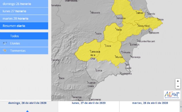 La Agencia Estatal de Meteorología ha activado el aviso amarillo por tormentas y por precipitaciones que pueden acumular 15 mm/h en el Noroeste, Altiplano y Vega del Segura. De momento no ha activado el aviso en el Valle del Guadalentín, pero dados los mapas que nos muestran los diferentes modelos meteorológicos, creemos que también se debería activar, así que precaución también en esta zona.