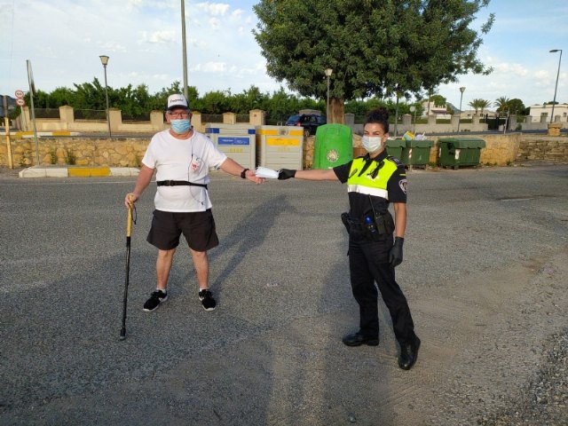 Efectivos de Policía Local y Guardia Civil y voluntarios de Protección Civil en esta localidad están repartiendo durante esta semana las 8.000 mascarillas asignadas por la Delegación del Gobierno, en un segundo lote, al municipio de Totana,.