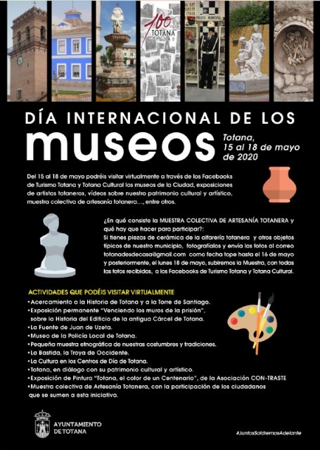 Por este motivo, las Concejalías de Cultura y Turismo han elaborado un programa de actividades que podréis visitar virtualmente del 15 al 18 de mayo en los perfiles corporativos de Facebook de Turismo Totana y Totana Cultural, respectivamente.