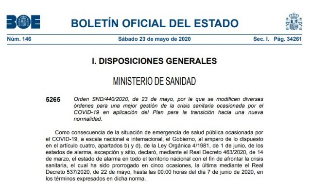 El Ministerio de Sanidad ha atendido, finalmente, las peticiones del Ejecutivo regional murciano en un número extraordinario del Boletín Oficial de Estado (BOE) de este sábado, que además introduce algunas novedades a las medidas de la fase 2 en la que la Región entrará el lunes, a excepción de Totana.