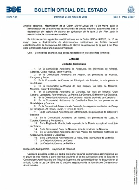 El Boletín Oficial del Estado (BOE) publica este domingo una orden que modifica el mapa territorial de la desescalada para mantener en la fase 1 a Totana, tras la solicitud ayer de la Administración regional de no avanzar a la fase 2, que implica menores restricciones, en esa localidad.