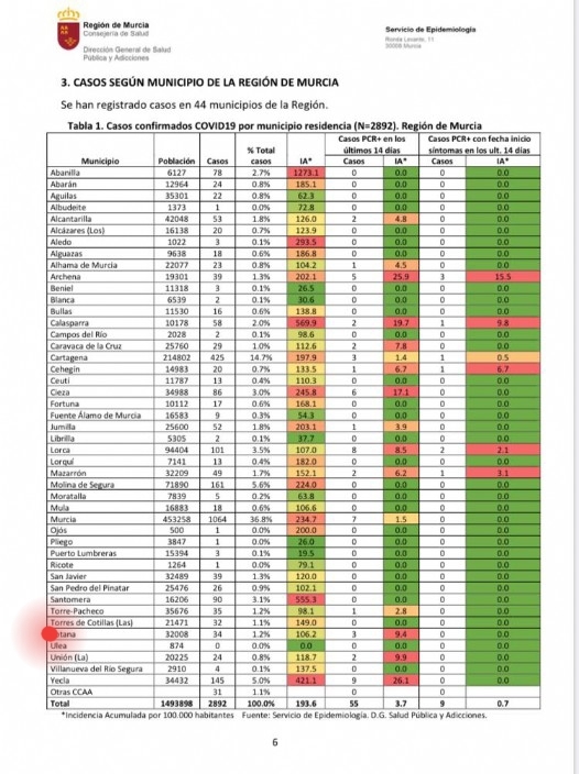 Este aumento se debe al rebrote que registró Totana hace unas dos semanas, pasando de los 25 casos contabilizados a los 34 mencionados, que obligó a permanecer en fase 1 como único territorio de la Región; si bien la evolución del brote parece controlada y puede ser motivo para que este municipio avance de fase en los próximos días; toda vez que lo estime oportuno el departamento de Salud Pública y Epidemiología de la Comunidad Autónoma.