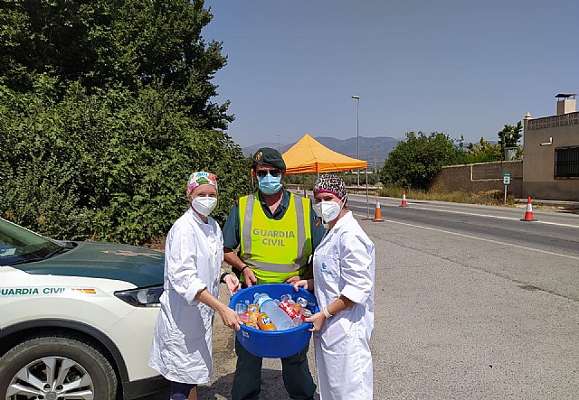 Es mediodía en Totana y el termómetro marca 35 grados a la sombra, cosa de la que carecen los guardias civiles encargados de controlar y vigilar los accesos al municipio de Totana. Es por eso que desde la Residencia La Purísima se han movilizado para poder hacer más llevadero el calor de los agentes y han cargado la furgoneta de la residencia y se han acercado hasta uno de los puntos de control para hacerles entrega de refrescos y agua fría para que pueda mantenerse hidratados y seguir desempeñando su trabajo.