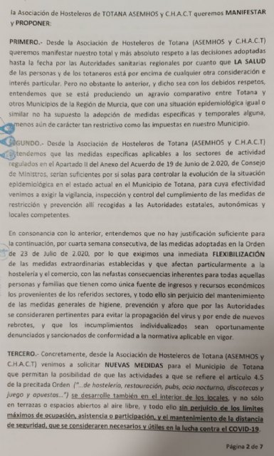 En definitiva, desde la Asociación de Hosteleros de Totana (ASEMHOS y C.H.A.C.T) entendernos y considerarnos que con la flexibilización de las medidas que por medio del presente comunicado se solicitan la Administracion no queda en modo alguno desarmada para proseguir la lucha contra la pandemia en el Municipio de Totana, juzgar por la copiosa batería de medidas que ya contiene la Orden del 19 de Junio mencionada y para cuya efectividad simplemente requiere, además de la cooperación colaboración ciudadana, de la vigilancia, inspección y control del estricto cumplimiento de las medidas de restricción y prevención allí recogidas a través de las Autoridades estatales, autonómicas y locales competentes, con los apercibimientos y SANCIONES correspondientes para quienes no las cumplan y/o no estén dispuestos a "Lo Ley nunca puede beneficiar a quien incumple", pero tampoco perjudicar a quienes desde el primer momento vienen cumpliendo con todas y cada una de las medidas de higiene, prevención y aforo (y otras muchas) que de un tiempo a esta parte han venido siéndoles exigidas por las Autoridades para permitirles el respetuoso y digno ejercicio de cuáles sean sus respectivas actividades profesionales, en este caso de hostelería.