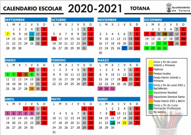 La Consejería de Educación aprobó hace unos días el calendario en los 45 municipios murcianos y se publicó en el BORM el pasado sábado 27 de mayo. El Consejo Escolar Municipal de Totana remitió hace varias semanas su propuesta para el curso 2020/21, que fue remitida a la Comunidad Autónoma para su aprobación definitiva.