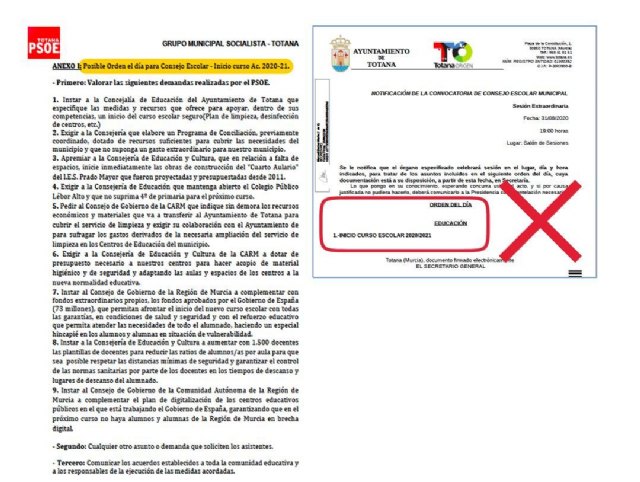 Para esta importante reunión el PSOE de Totana aportaba un completo, pero abierto “Orden del día” con el fin de abordar de manera eficaz la dramática situación que vive la comunidad educativa en el inicio de este curso escolar. Sin embargo, el concejal de Educación, ha decidido convocar el consejo escolar con el exclusivo Punto 1. INICIO DEL CURSO ESCOLAR 2020/21.