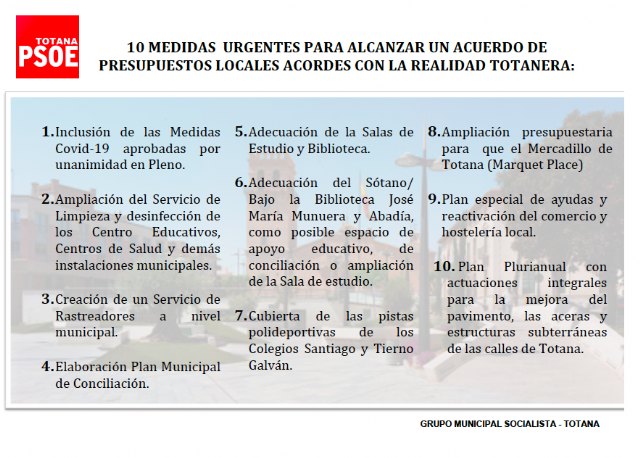 Sin embargo, el Grupo Socialista manifiesta su disposición a colaborar en la aprobación de los presupuestos municipales del año 2020, siempre y cuando el equipo de gobierno incluya las siguientes 10 medidas que consideramos urgentes y necesarias para paliar las consecuencias de la pandemia: