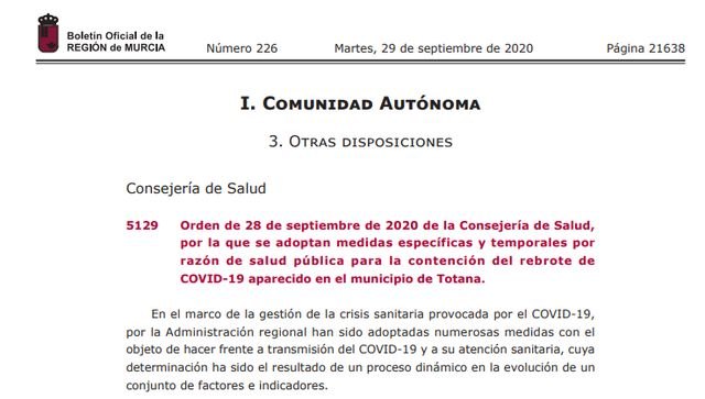 Orden de 28 de septiembre de 2020 de la Consejería de Salud, por la que se adoptan medidas específicas y temporales por razón de salud pública para la contención del rebrote de COVID-19 aparecido en el municipio de Totana.