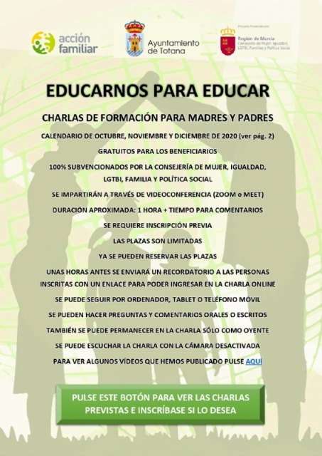La Concejalía de Bienestar Social, a través del Servicio Municipal de Prevención de Drogodependencias, vuelve a poner en marcha el programa “Escuela de Padres”, en virtud del acuerdo de colaboración con la Asociación “Acción Familiar”; que permitirá la oferta de charlas que se impartirán on line debido a la actual situación, y que son totalmente gratuitas.