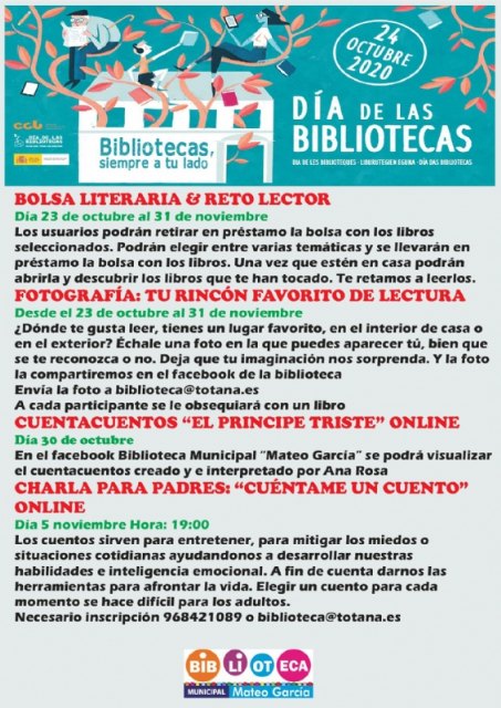 Por último, el 5 de noviembre será la charla para padres “Cuéntame un cuento” online, a partir de las 19:00 horas; para lo que se hace necearia la inscripción a través del teléfono 968 421089 o biblioteca@totana.es