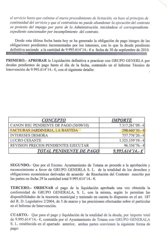GENERALA fue adjudicataria del Servicio de Recogida de Basura, limpieza diaria y otras cosas en 2007 cuando gobernaban los "transparentes y buenos gestores". Como la sociedad no cobró ni un euro en 3 años, en 2010 exigió la resolución de un contrato que tenía una duración cercana a los 20 años.