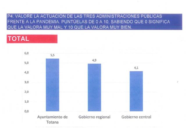 En el estudio sociológico realizado desde el día 3 al 13 de noviembre entre los vecinos y vecinas de Totana, obtenemos como resultado que ante la pregunta "Valore la actuación de las tres administraciones públicas frente a la pandemia", el Ayuntamiento de Totana es la mejor valorada frente a la regional y estatal.