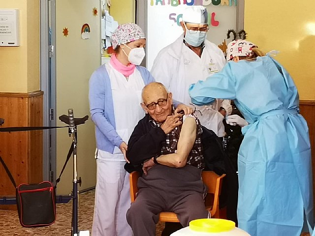 El primer residente en ser vacunado ha sido Antonio Ortuño Tomás natural de Alcantarilla de 83 años de edad.