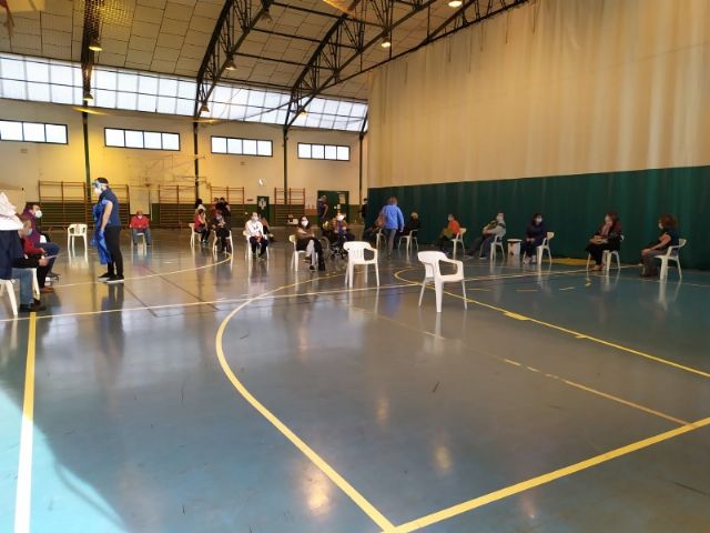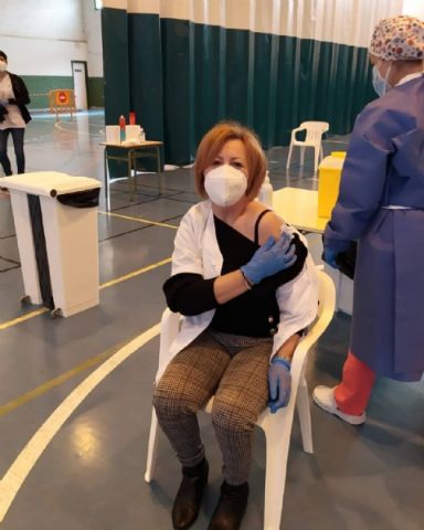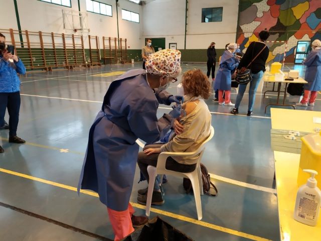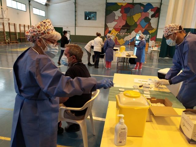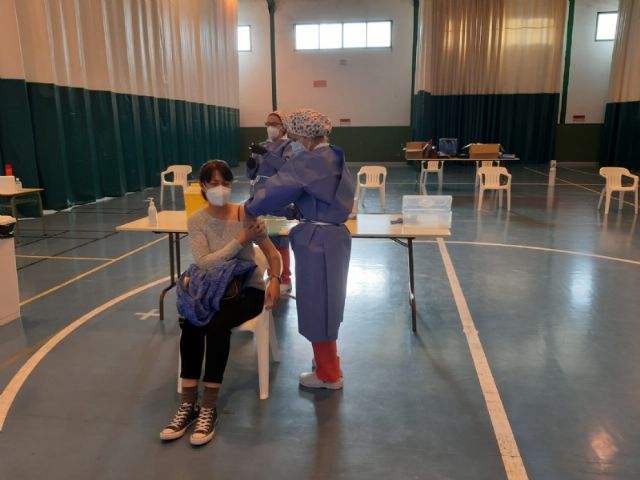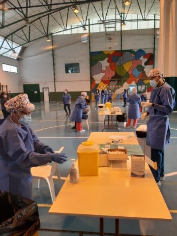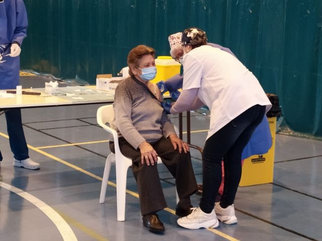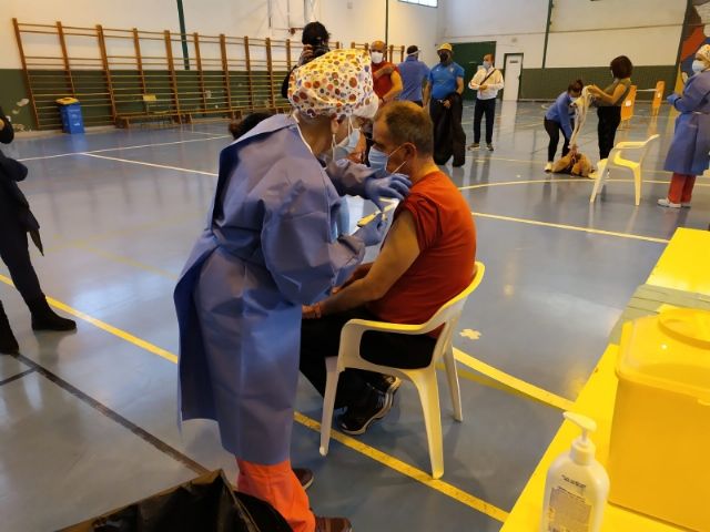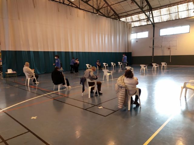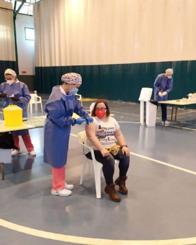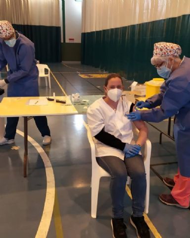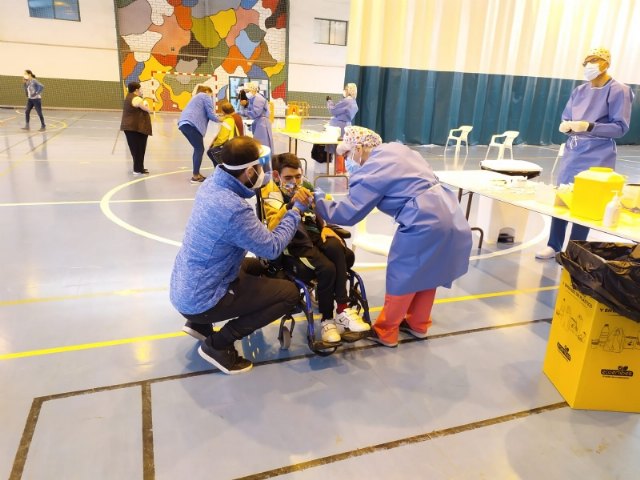 La Sala Escolar de Totana ha sido el lugar elegido para inocular las 129 vacunas de la primera dosis contra el COVID-19 a los usuarios y trabajadores sociosanitarios empleados en los 3 Centros de Día dependientes del Ayuntamiento, en este caso, los dos para la Discapacidad y el de Estancias Diurnas de Personas Mayores con los que cuenta la localidad.