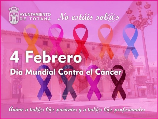 El Ayuntamiento de Totana quiere sumarse hoy, día 4 de febrero, a la celebración del Día Mundial contra el Cáncer lamentando la situación de fragilidad social y sanitaria que están padeciendo los enfermos y sus familias, agravada a raíz de la pandemia por el COVID-19; y abogando por que se lleven a cabo las acciones pertinentes para pailar su situación de especial vulnerabilidad.