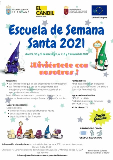 La Concejalía de Juventud informa de que el próximo lunes, día 8 de marzo, se abre el plazo de presentación de inscripciones para la Escuela de Semana Santa.