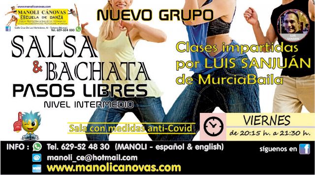 La Escuela de Danza Manoli Cánovas consciente de esto, ha hecho un esfuerzo por adecuar sus instalaciones a fin de garantizar esa seguridad, por lo que pudo comenzar en Octubre el curso. Ahora amplía su oferta de clases con un nuevo grupo de pasos libres de Salsa y Bachata.