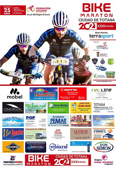 La Asociación Deportiva Peña Las Nueve, os invita a una nueva edición del XXIII Bike Maratón de BTT Ciudad de Totana - Gran Premio Terra Sport, prueba nacional puntuable para Circuito de XCM de la Región de Murcia. Por motivos de protocolo COVID, este año cambia su emplazamiento a la Ciudad Deportiva Valverde Reina, la fecha como es tradicional será el último domingo de abril (25/04/2021).
