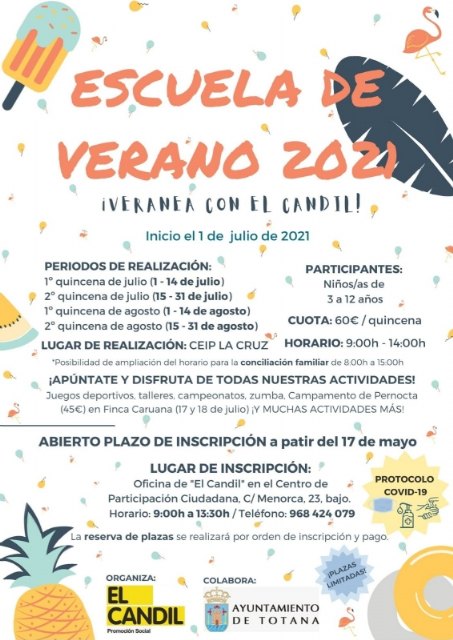 La Concejalía de Juventud abre este lunes, 17 de mayo, el plazo de inscripción para participar en la Escuela de Verano´2021-Servicio de Conciliación de la Vida Laboral y Privada en período de vacaciones estival, concretamente desde el 1 de julio al 31 de agosto, que organiza el Colectivo para la Promoción Social “El Candil”.