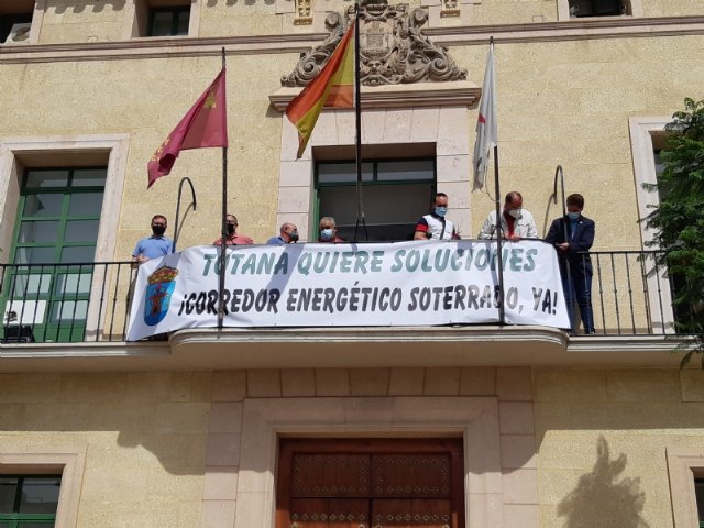 El alcalde, Juan José Cánovas, y los portavoces de todos los grupos políticos que conforman la Corporación municipal, junto con portavoces de las plataformas vecinales, colocaron una pancarta en la fachada principal del Consistorio totanero, que permanecerá durante las próximas semanas con el lema “Totana quiere soluciones. ¡Corredor energético soterrado, ya!”.