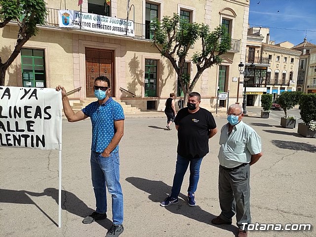 Más de medio centenar de afectados se concentraron hoy para apoyar el simbólico acto de colocación de una pancarta en la fachada principal consistorial bajo el lema “Totana quiere soluciones. ¡Corredor energético soterrado, ya!”