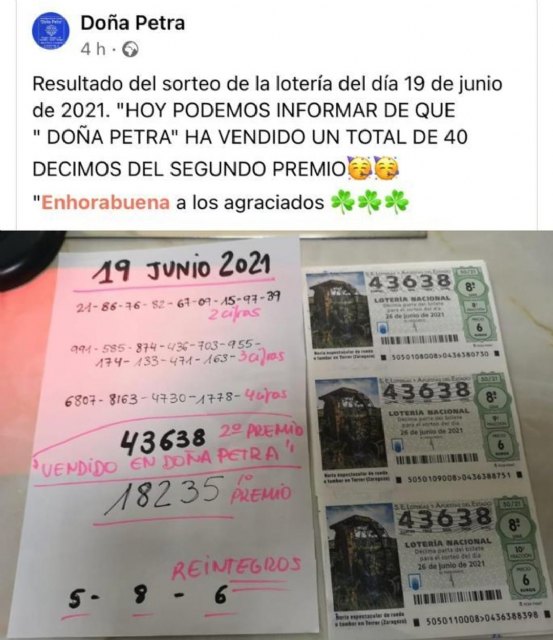 En el caso de Totana han sido agraciados varios clientes de un bar que llevan años abonados a dicho número del que se han vendido 40 décimos con un premio total de 480.000 euros, según ha informado la la administración Doña Petra en redes sociales