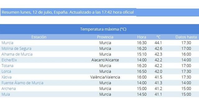 El dato más alto se ha registrado hoy en el Observatorio Meteorológico de Murcia, con 44,2º: en la tabla aparecen datos promediados en 10 minutos; de ahí la diferencia en alguna décima.