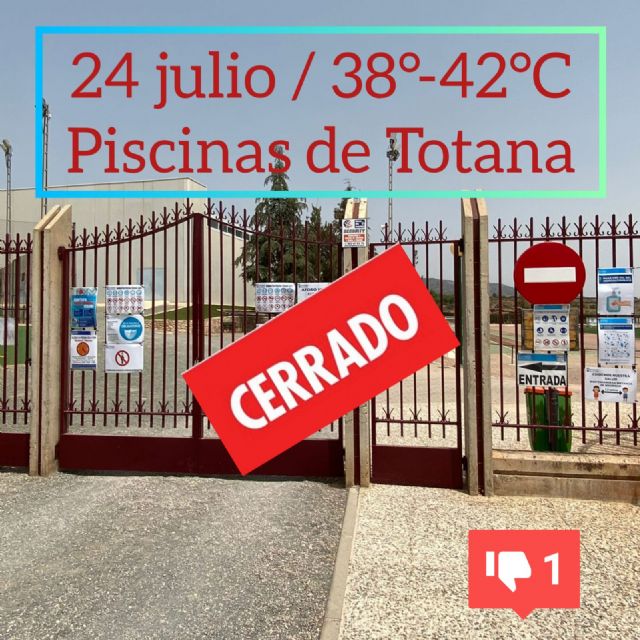 24 de Julio, 38°-42° C y las piscinas públicas de Totana permanecen cerradas por la incapacidad del Concejal de Deportes para ponerlas en marcha tras dos años cerradas, tiempo más que suficiente para haber hecho todas las obras necesarias para su puesta en marcha.