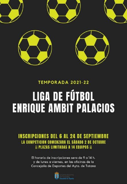La Concejalía de Deportes tiene previsto poner en marcha la nueva temporada de la Liga de Fútbol "Enrique Ambit Palacios" 202/2022 el próximo 6 de septiembre con la apertura de inscripciones, cuyo plazo finalizará el viernes 24 de septiembre, con la idea de comenzar la competición el primer fin de semana del mes de octubre, correspondiente a los días sábado 2 y domingo 3 de octubre.